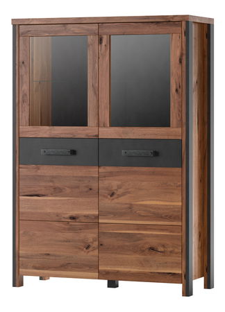 Vitrína s prosklenými dvířky Buena se šesti policemi. Horní dvě police jsou skleněné a můžete je podsvítit LED osvětlením. Nábytek s nádechem starého stylu, gramofonových desek ze série Buena. Vhodný do obývacího pokoje i kanceláře. Nabízíme k dokoupení LED osvětlení.