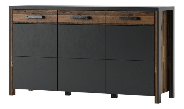 Designová komoda Buena třídveřová. Nabízí úložný prostor v podobě skřínek s policemi. Nábytek s nádechem starého stylu, gramofonových desek ze série Buena. Vhodný do obývacího pokoje i kanceláře.
