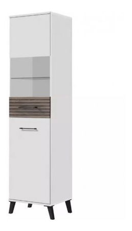 Vitrína kombinuje funkčnost s moderním designem, ideální pro zobrazování dekorací nebo uchovávání vašich oblíbených předmětů. Je vyrobena z kvalitního laminátu na korpus i přední stranu, což zaručuje její odolnost a snadnou údržbu. Kovové úchyty a plastové nohy výšky 12 cm přidávají nábytku stabilitu a umožňují snadné čištění pod vitrínou. Lemování je zhotoveno z ABS materiálu na deskách a čelech, zatímco ostatní části jsou olemovány papírem, což dodává celkovému vzhledu eleganci. Vitrína obsahuje dvě dveří a jednu zásuvku na kuličkových vodičích GTV H-35, které umožňují plnovýsuv a hladké ovládání. Dále vitrína nabízí jednu otevřenou poličku z pevného skla, ideální pro vystavení dekorací nebo knih, čímž poskytuje praktickou a zároveň esteticky přitažlivou možnost uskladnění.