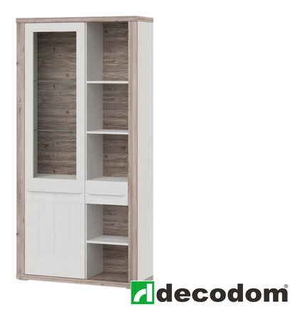 Pěkná a prostorná vitrína mě na levé straně skleněné dveře, které se otevírají do levé strany. V prosklené části se nacházejí skleněné police, které mají nosnost do 6 kg. V pravé části se nacházejí tři police a jedna zásuvka.