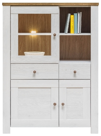 Zajímavá dvoudílná vitrína, která se bude skvěle vyjímat ve Vaší pestré jídelně. Na spodku je komoda vybavena širší a užší skříňkou nad kterými se nacházejí 2 zásuvky (širší a užší). Nad prostředními zásuvkami se na pravé straně nacházejí 2 otevřené police a na straně levé se nacházejí prosklená dvířka vitríny. Za prosklenými dvířky (čiré sklo) se nachází jedna dřevěná polička. Zajímavé drobné kulaté úchyty na dvířkách a zásuvce příjemně osvěží světlé provedení. K vitríně lze dokoupit doplňkové LED osvětlení, které naleznete níže na této stránce v sekci doporučujeme dokoupit.