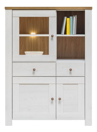 Zajímavá dvoudílná vitrína, která se bude skvěle vyjímat ve Vaší pestré jídelně. Na spodku je komoda vybavena širší a užší skříňkou nad kterými se nacházejí 2 zásuvky (širší a užší). Nad prostředními zásuvkami se na pravé straně nacházejí 2 otevřené police a na straně levé se nacházejí prosklená dvířka vitríny. Za prosklenými dvířky (čiré sklo) se nachází jedna dřevěná polička. Zajímavé drobné kulaté úchyty na dvířkách a zásuvce příjemně osvěží světlé provedení. K vitríně lze dokoupit doplňkové LED osvětlení, které naleznete níže na této stránce v sekci doporučujeme dokoupit.