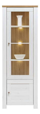 Styl a dominance této vysoké vitríny jsou nepřehlédnutelné. Z prosklenými dvířky (čiré sklo) se nacházejí 3 poličky. Na spodku vitríny je umístěna skříňka s jedněmi dvířky. Zajímavé drobné kulaté úchyty na dvířkách v provedení dub příjemně osvěží světlé provedení. K vitríně lze dokoupit doplňkové LED osvětlení (3 LED), které naleznete níže na této stránce v sekci doporučujeme dokoupit.