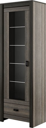 Úzká policová vitrína s pěti skleněnými poličkami. Nabízíme možnost dokoupit 3 kusy dverených poliček pod označením DN-03P. Na spodku vitríny se nachází jedna zásuvka.