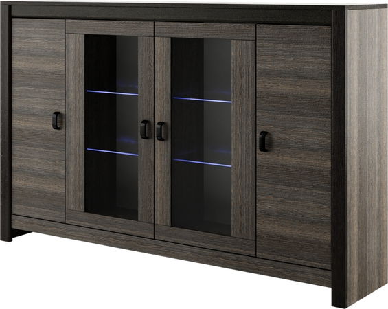Široká prosklená vitrína s množstvím odkládacího prostoru. Vitrína má 4 dvířka a 2 z nich ve středu jsou prosklené.