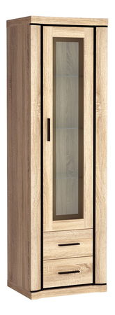 ZobrazitKrásná vitrína ozvláštněná jednoduchým designem se uplatní nejen v obýváku, ale své místo si najde také v ložnici či pracovně. Tři skleněné police uvnitř vitríny ji dělají jedinečnou, vypadá úžasně a jistě upoutá pozornost. Nábytek má kromě polic také dvě zásuvky, velmi funkční, ideální pro schování drobností a doplňků. Kovové úchyty ladící s černými dekoracemi v podobě lišt udělají na každého dobrý dojem.