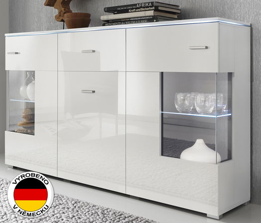 Moderní vitrína Essen je vyrobena z těch nejkvalitnějších materiálů. Všechny komponenty tohoto nábytku jsou vyrobeny v Německu. Korpus je matné bílé barvy, přičemž dvířka jsou ve vysokém lesku. Prosklené části vitríny jsou z čirého skla a je možné si přiobjednat efektní RGB osvětlení, při kterém máte možnost vybrat si až z devíti různých barev podsvícení. Díky tomu si můžete podle nálady měnit atmosféru místnosti. Doporučujeme kombinovat s obývací stěnou Essen.
