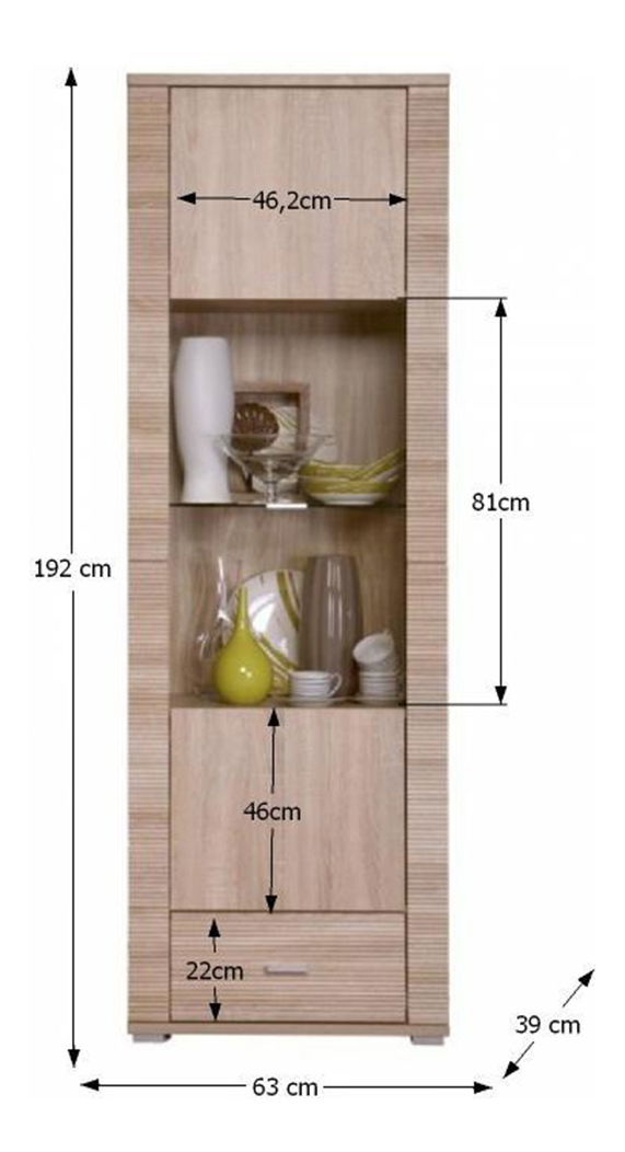 Vitrína Gary Typ 05 1W1S o výšce 192 cm a hloubce 39 cm je ideální pro zařízení vašeho obývacího prostoru, ložnice nebo pracovny. Tento sektorový nábytek od GrandNábytku je vyroben z kvalitní laminované DTD v příjemném odstínu Dubu Sonoma, který dodává elegantní dotek každému prostoru. Hrany jednotlivých komponent jsou ukončeny vroubkovanou lištou pro dokonalý finiš. Vitrína se dodává v demontu a její rozměry jsou 63x192x39 cm. Materiál korpusu má tloušťku 16 mm, vrchní i spodní deska mají tloušťku 22 mm. Vhodná pro zařízení větších prostor, kde se bude skvěle vyjímat.