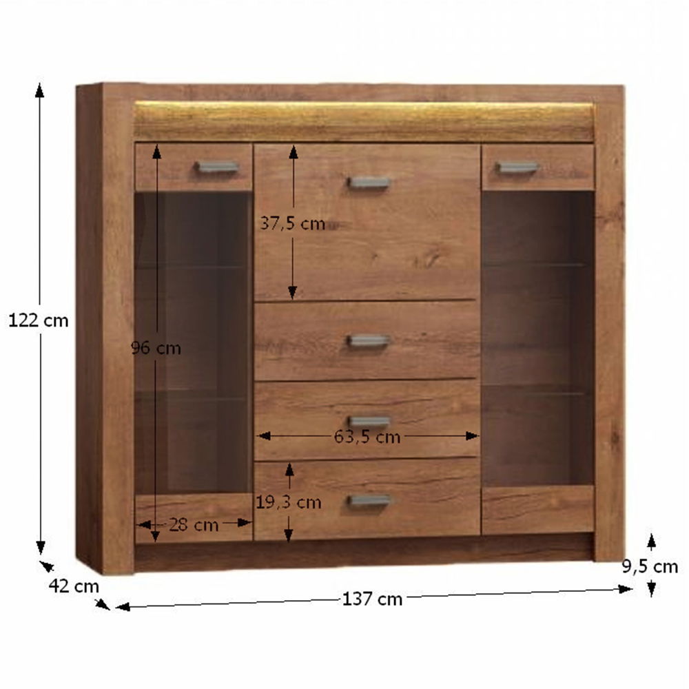 Luxusní sektorový nábytek vysoké kvality v masivním designu s prvky surového malovaného dřeva a výraznou reliéfní kresbou, s efektivním LED podsvícením, vhodný na zařízení obývacích pokojů a jídelen, korpus hrubý až 48 mm, úchyty kovové. Možnost dokoupení LED osvětlení. Materiál: DTD laminovaná, ABS hrany