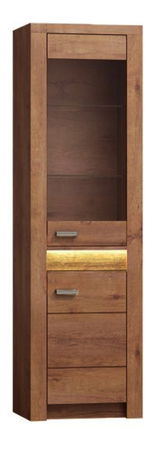 Vysoká vitrína Inneas v barevném provedení jasan světlý. Tato luxusní vitrína se výborně hodí do obývacích pokojů a jídelen. Ve spodní části se nacházejí malé dvířka a vrchní část obsahuje velké prosklené dvířka a dvě poličky. K vitríně lze doobjednat efektní LED osvětlení, které se instaluje na přední stranu mezi úchyty spodních a vrchních dvířek. Vitrína je dodávána v demontu.