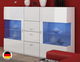 Moderní vitrína, kterou je vhodné kombinovat s obývací stěnou Jena. Je vyrobena v Německu z kvalitních materiálů. K proskleným poličkám si můžete přiobjednat modré podsvícení. To působí příjemně a uklidňující. Korpus je matné bílé barvy a fronty jsou ve vysokém lesku.