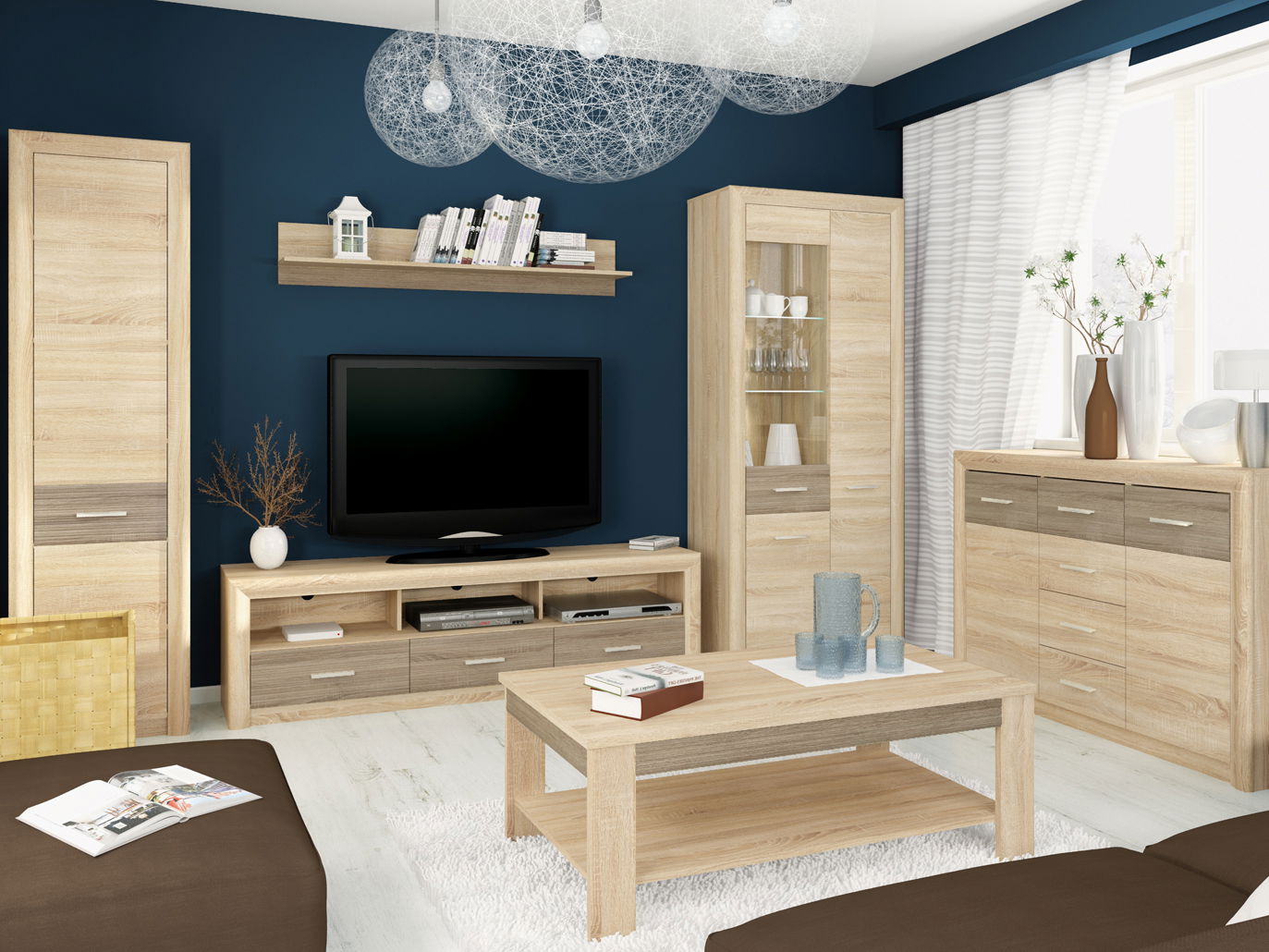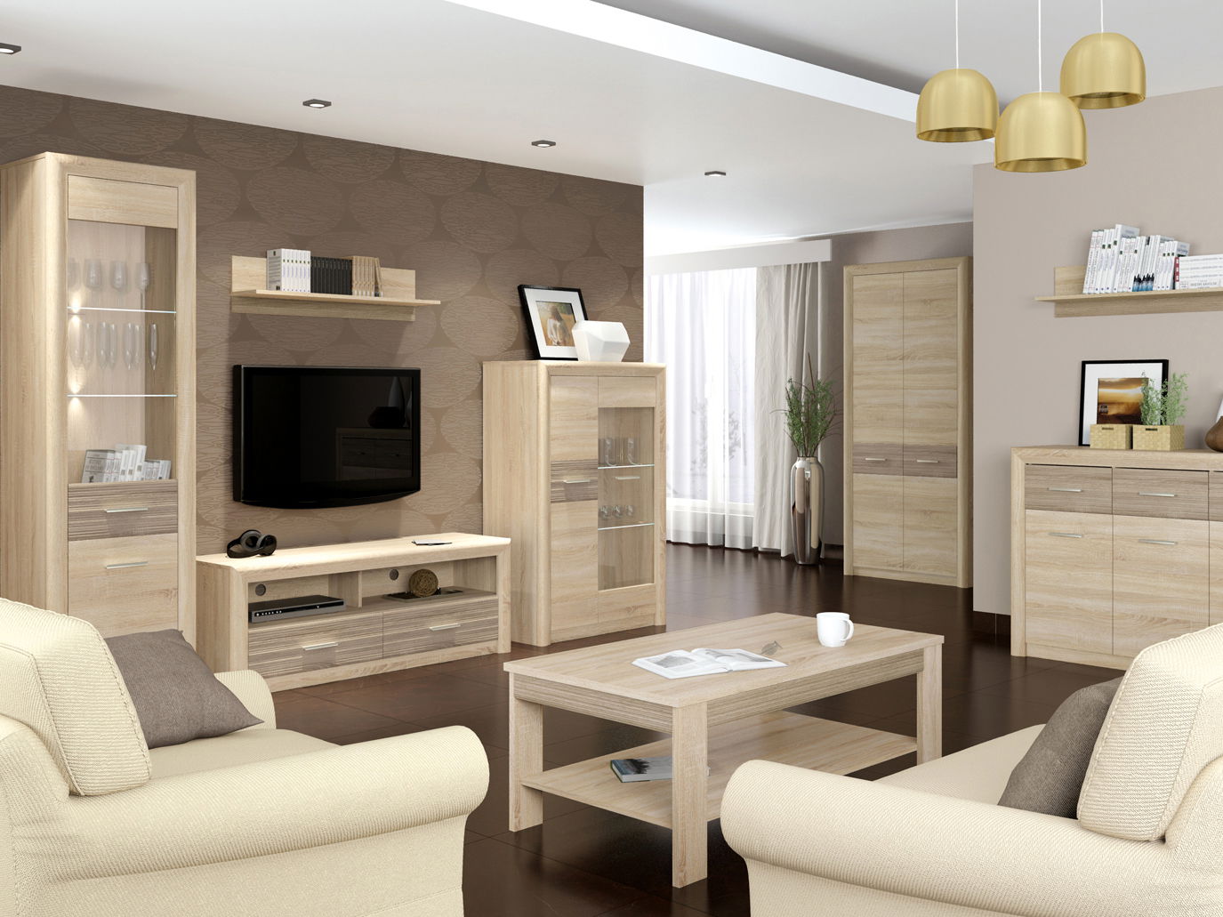 kolekce vyrobena z laminovaných desek ve velmi módní barvě světlého Dubu sonoma, která byla spojena s rýhovanou MDF vložkou v barvě Dub sonoma lanýž. Široké, zakřivené MDF rámečky kolem těla zdůrazňují to, co je pro tento projekt nejdůležitější - spolehlivost při současné jemnosti, která se osvědčí v každém interiéru domácnosti. Eleganci přidává nábytku tříbodové LED osvětlení a úchyty v barvě šampaňská, představující ideální dokončení této rázu plné kolekce.