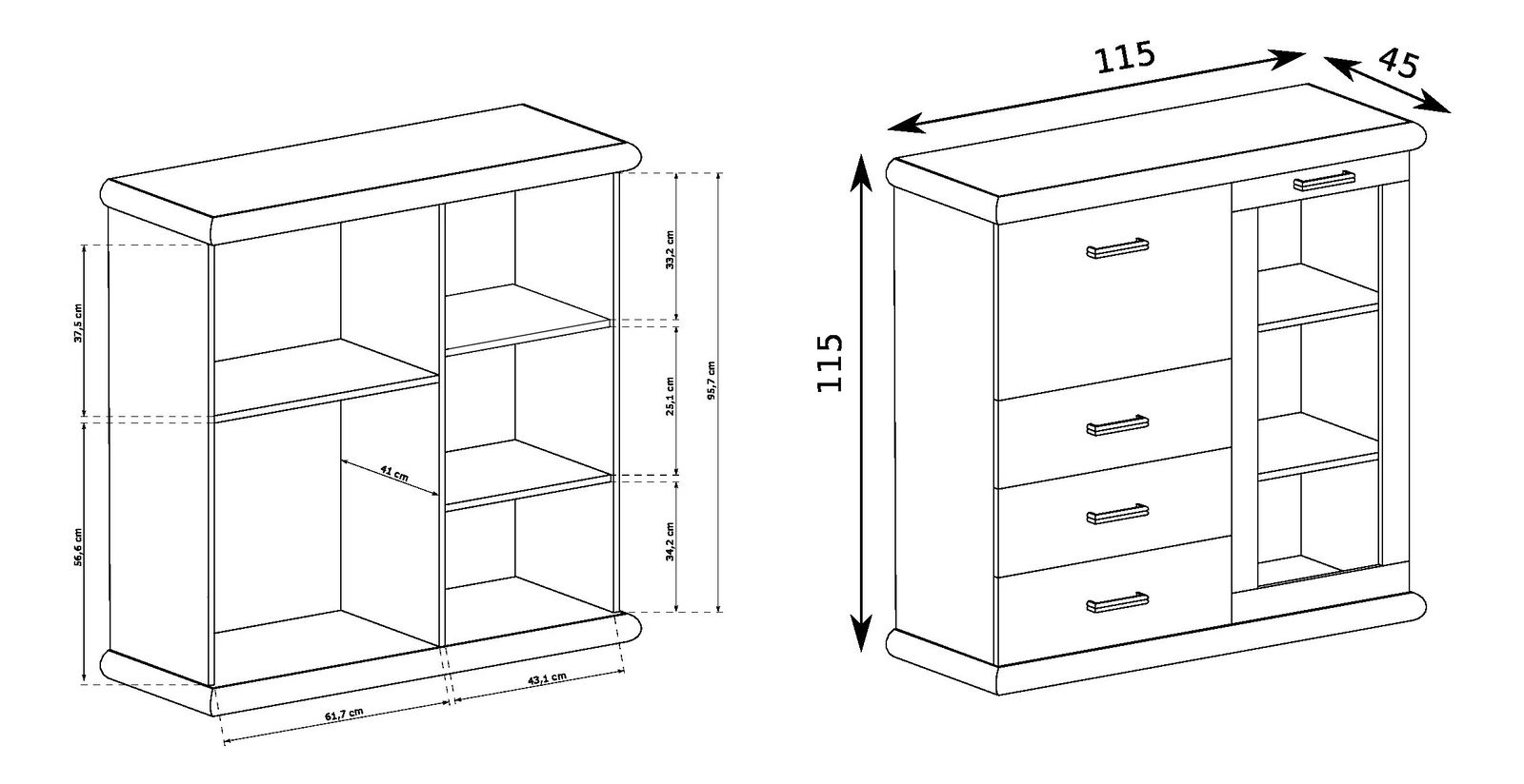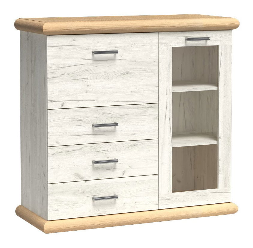 Elegantní vitrína, která se skvěle hodí do obývacího pokoje, jídelny a ložnice. Má tři zásuvky, do kterých můžete uložit spoustu věcí, oblečení, doplňků. Nad nimi se nachází bar, který činí kus nábytku zvláštním a jedinečným. Uvnitř je také skříňka se dvěma policemi. Díky tvrzenému sklu, které zde bylo použito, věci uvnitř vypadají v místnosti krásně. Celý je vyroben z odolných laminovaných desek a kovových úchytek a pantů, což dokazuje odolnost nábytku.
