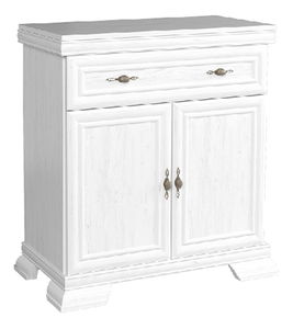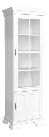 Úzká vitrína Kraz s prosklenými dvířky bude skvostem ve vašich obývacích pokojích, jídelnách a pracovnách. Masivní vzhled, ozdobné vyřezávané nožičky, kovové úchyty na dvířkách vystihují rustikální styl vitríny. Dodává se v barevném provedení sosna andersen.