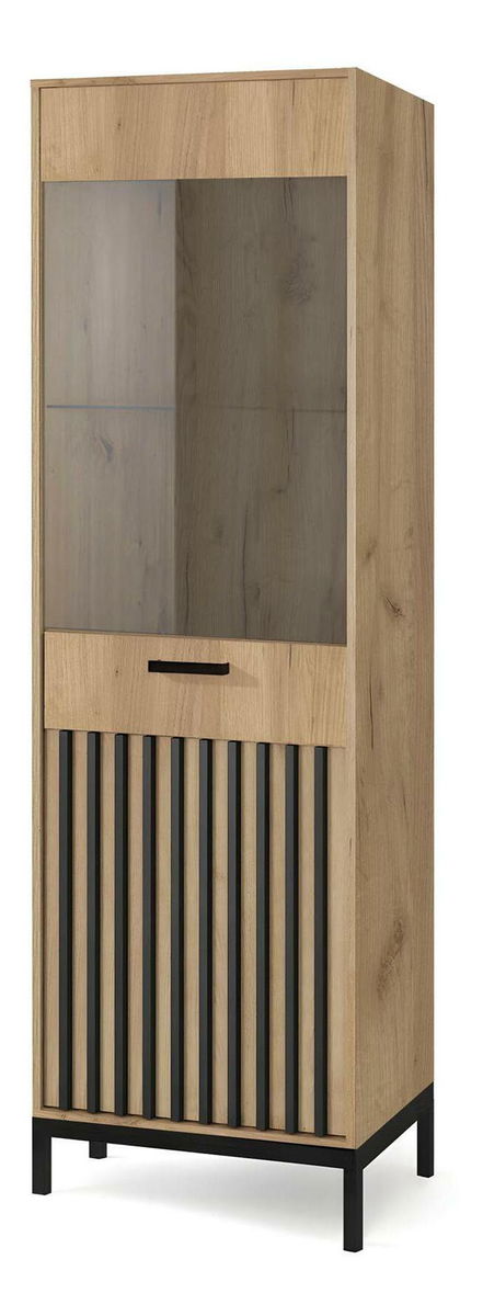 ZobrazitVitrína Lamello ve skandinávském stylu je elegantním a praktickým kusem nábytku, ideálním pro zobrazování a ukládání různých předmětů. Je vyrobena z laminované nábytkové desky, odolné a snadno udržovatelné. Má černé ocelové nohy, práškově lakované, které poskytují stabilní základ o výšce 14 cm. Tato vitrína obsahuje jedny dveře zdobené lamelami, což přidává na estetické hodnotě, a jsou vybaveny černými, podlouhlými plastovými úchyty pro snadné otevírání. Uvnitř vitríny se nachází jedna skleněná police, ideální pro prezentaci dekorativních předmětů, zatímco čiré sklo umožňuje nepřetržitý vizuální přístup. Přestože vitrína neobsahuje osvětlení, její jednoduchý a čistý design skvěle doplňuje moderní interiéry, akcentujíc skandinávskou estetiku s důrazem na funkčnost a styl.
