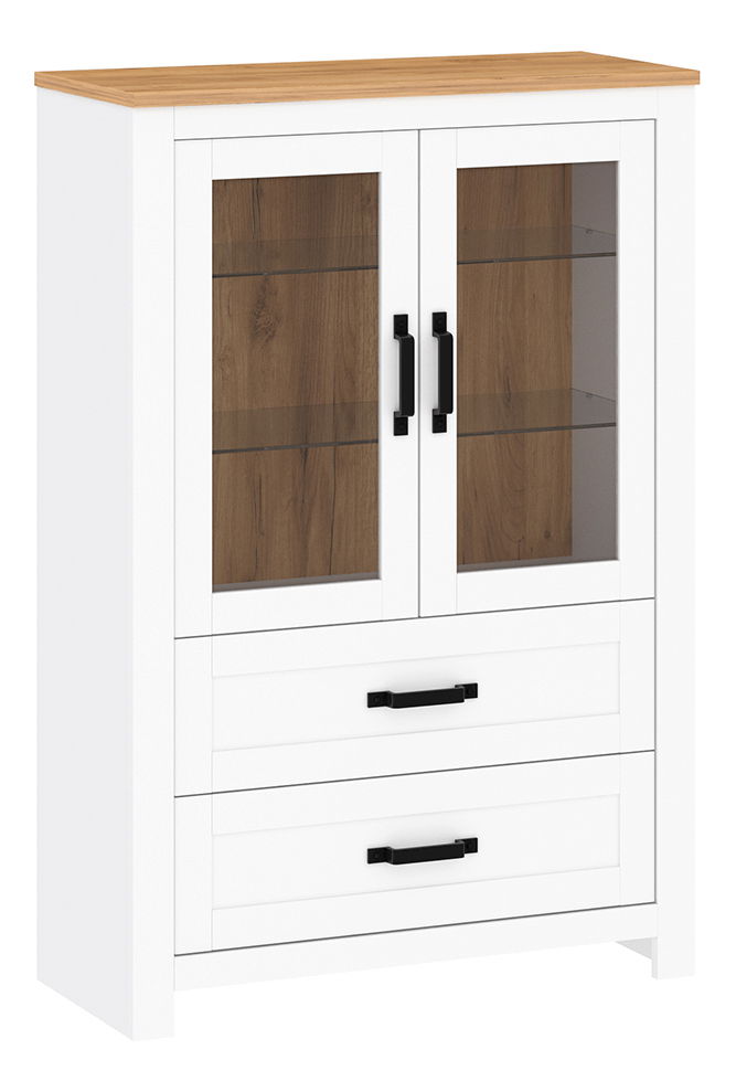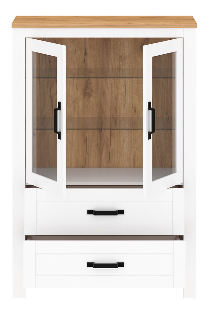 Vitrína Lanuelle K o výšce 40,7 cm a hloubce 140 cm je bílá a vyrobena z laminované DTD desky s ABS hranami. Korpus je tloušťky 16 mm, vrchní deska 22 mm a dveře mají tloušťku 19 mm. Ve skříňce se dvěma dveřmi se nacházejí dvě zásuvky a prostor s ozdobnými úchyty. Vitrína je vhodná pro uskladnění různých předmětů a má výšku spodního prostoru od podlahy 7,2 cm. Dodává se v demontu a bez LED osvětlení, ale lze si jej dokoupit. Celkové rozměry skříňky jsou 93,7x40,7x140 cm.