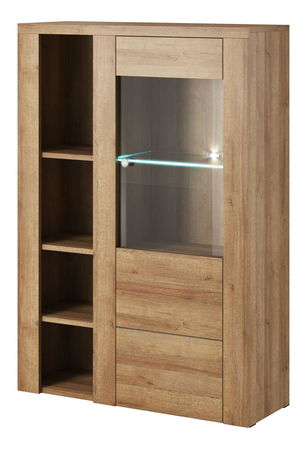 Vitrína s prosklenou horní částí dvířek, za kterými jsou police V levé části regálový systém polic bez dvířek. Ideální místo pro uložení a vystavení knih a fotografií. Prosklenou část lze podsvítit LED osvětlením. Přírodní styl nábytku ze série Larita, vhodný do obývacího pokoje i pracovny..