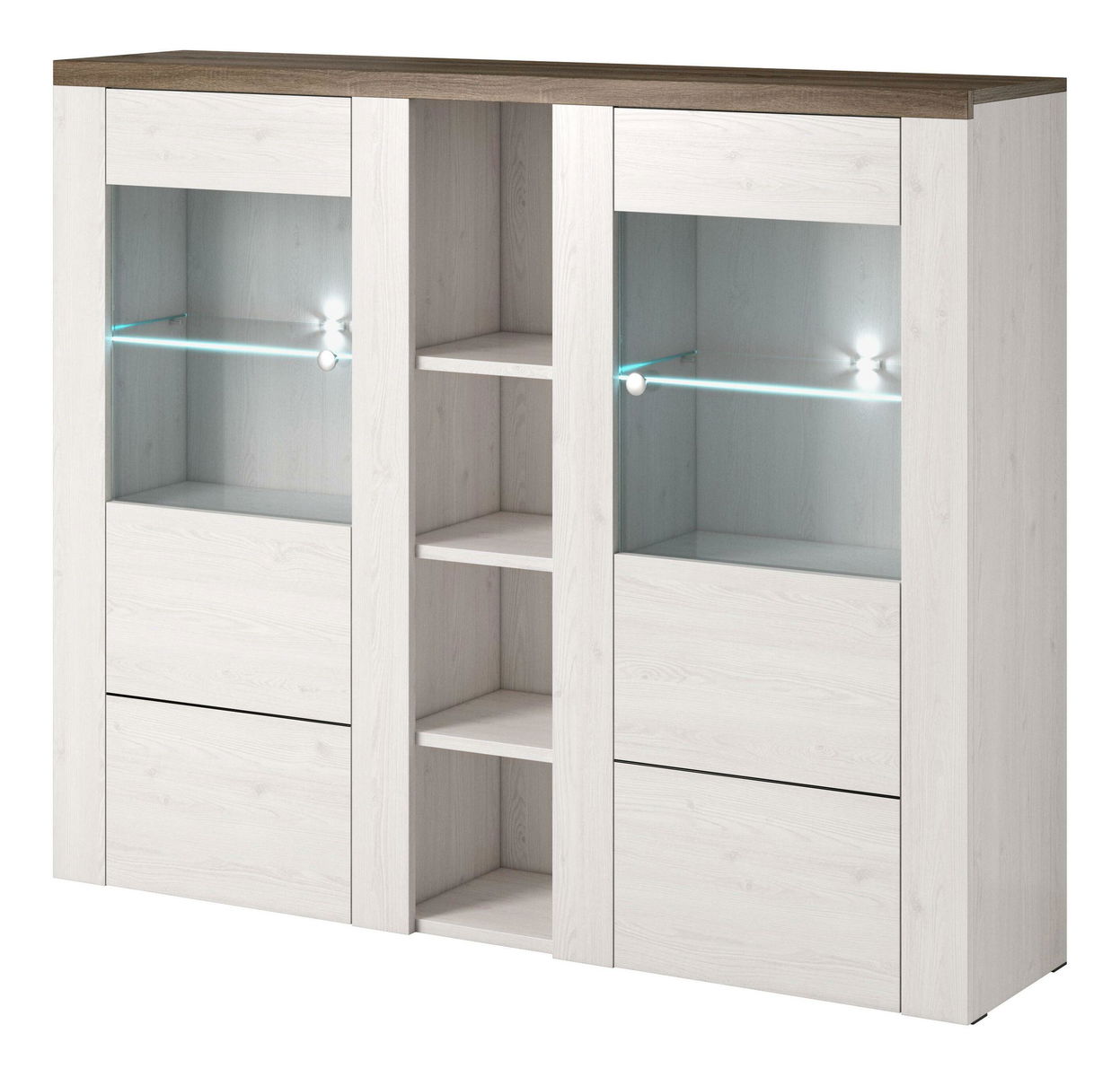 ZobrazitDvoudvéřová vitrína s poličkami a ve střední části regálový systém polic bez dvířek. Prosklenou část lze podsvítit LED osvětlením. Přírodní styl nábytku ze série Larita, vhodný do obývacího pokoje i pracovny.