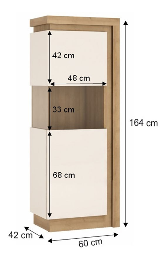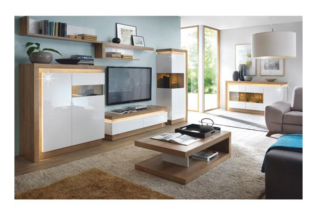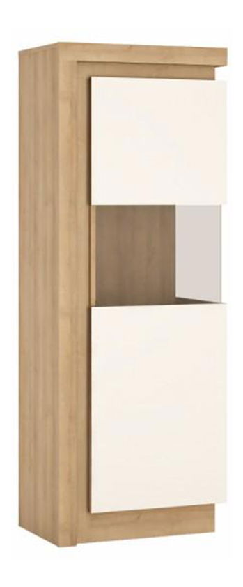 Pokud toužíte po nábytku, který by Vám ozvláštnil interiéry, vitrína z modelové řady Leonan je tou správnou volbou. Svěží moderní design je doplněn o efektní LED osvětlení po obvodu vitríny, což dodá Vaší obývacím pokoji příjemnou atmosféru. Dvířka mají dotykové otevírání a zavírání soft closing. Použitý materiál je odolný vůči poškrábání a vlhkosti. K vitríně je možné přiobjednat jednobodové nebo dvoubodové LED osvětlení Square. Barevné provedení je dub riviera + extra vysoký lesk bílý. Pravé provedení vitríny.