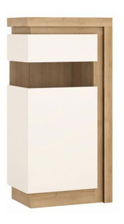 Pokud toužíte po nábytku, který by Vám ozvláštnil interiéry, vitrína z modelové řady Leonan je tou správnou volbou. Svěží moderní design je doplněn o efektní LED osvětlení po obvodu vitríny, což dodá Vaší obývacím pokoji příjemnou atmosféru. Dvířka mají dotykové otevírání a zavírání soft closing. Použitý materiál je odolný vůči poškrábání a vlhkosti. K vitríně je možné přiobjednat jednobodové nebo dvoubodové LED osvětlení Square. Barevné provedení je dub riviera + extra vysoký lesk bílý. Levé provedení vitríny.