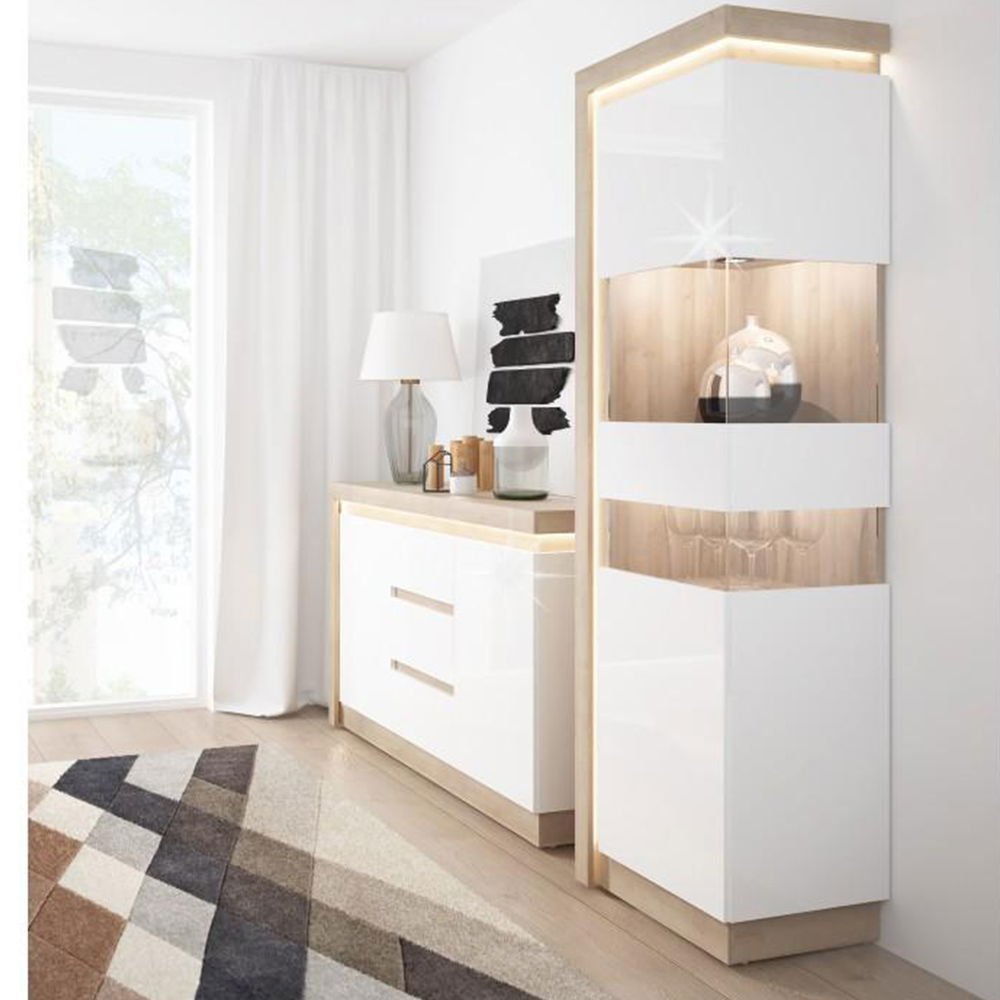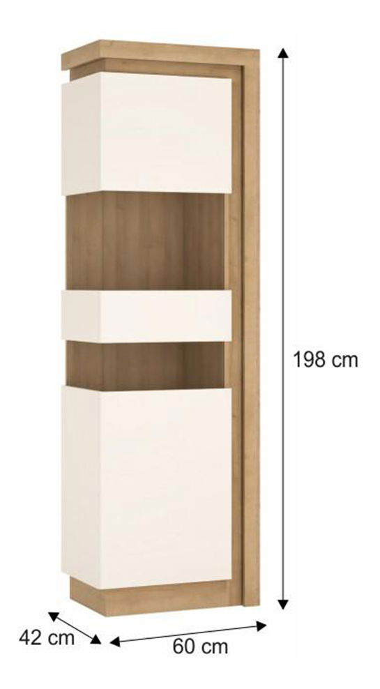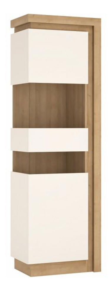 Pokud toužíte po nábytku, který by Vám ozvláštnil interiéry, vitrína z modelové řady Leonan je tou správnou volbou. Svěží moderní design je doplněn o efektní LED osvětlení po obvodu vitríny, což dodá Vašemu obývacím pokoji příjemnou atmosféru. Dvířka mají dotykové otevírání a zavírání soft closing. Použitý materiál je odolný vůči poškrábání a vlhkosti. K vitríně je možné přiobjednat jednobodové nebo dvoubodové LED osvětlení Square. Barevné provedení je dub riviera + extra vysoký lesk bílý. Levé provedení vitríny.