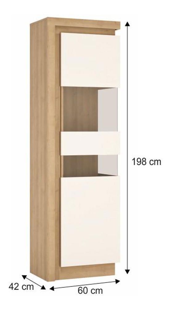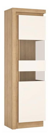Pokud toužíte po nábytku, který by Vám ozvláštnil interiéry, vitrína z modelové řady Leonan je tou správnou volbou. Svěží moderní design je doplněn o efektní LED osvětlení po obvodu vitríny, což dodá Vaší obývacím pokoji příjemnou atmosféru. Dvířka mají dotykové otevírání a zavírání soft closing. Použitý materiál je odolný vůči poškrábání a vlhkosti. K vitríně je možné přiobjednat jednobodové nebo dvoubodové LED osvětlení Square. Barevné provedení je dub riviera + extra vysoký lesk bílý. Pravé provedení vitríny.
