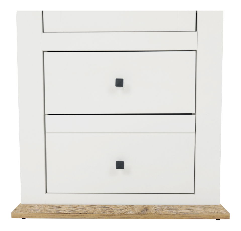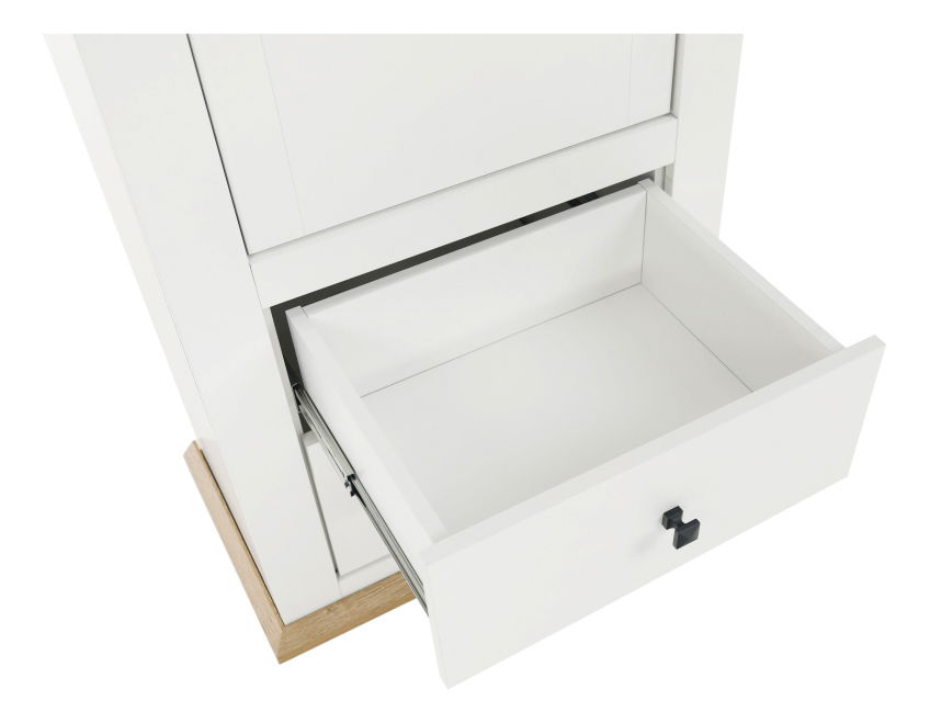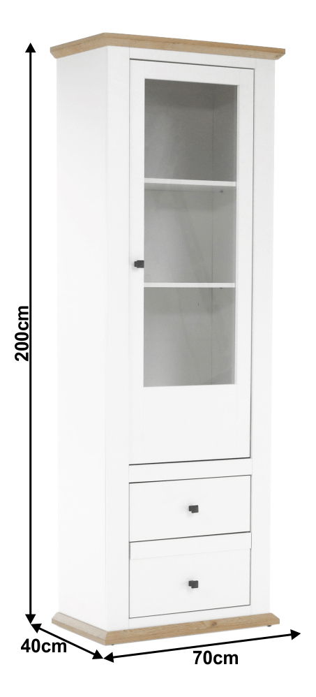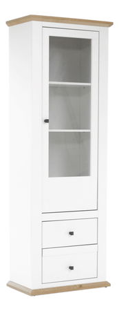 Vitrína Leoras MZ4 (bílá + dub grand) je elegantní a funkční vitrína o výšce 200 cm a hloubce 40 cm. Je vyrobena z DTD laminované desky a má ABS hrany, které zajišťují její odolnost a trvanlivost. Barva vitríny je bílá a dub grand a její tloušťka materiálu je 40 mm. Vitrína má jednu dveře, dvě zásuvky a police, takže nabízí dostatek úložného prostoru. Má také prosklené dveře, které umožňují přehledné uložení věcí a kovové úchyty pro dokonalý vzhled. S 3D efektem dodává místnosti moderní nádech. Vitrína se dodává v demontu, ale její sestavení je snadné a rychlé. Vhodná do každého interiéru.