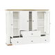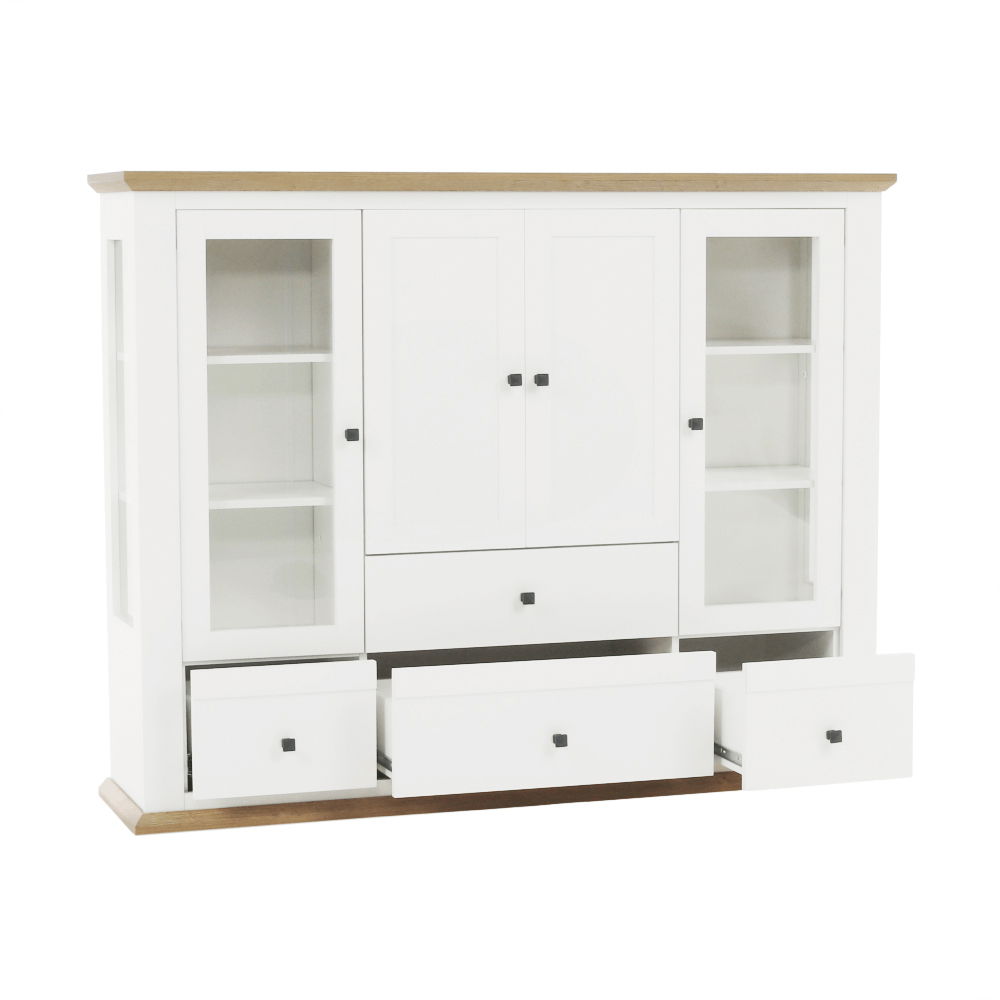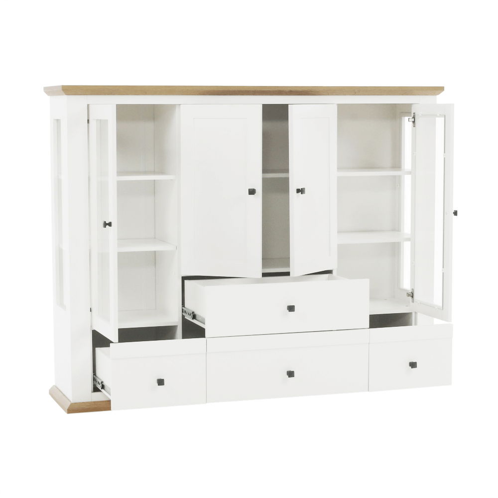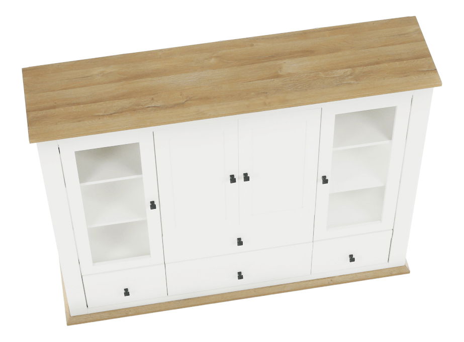 Vitrína Leoras MZ6 (bílá + dub grand) je elegantní skříň vhodná do každého obývacího pokoje. Je vyrobena z DTD laminovaného materiálu s ABS hranami a má tloušťku materiálu 40 mm. Vitrína má bílou barvu s dub grand detaily, výšku 130 cm a hloubku 40 cm. Obsahuje čtyři skříňky, čtyři zásuvky, polici a kovové úchytky. Vitrína má prosklené dveře s 3D efektem, které zajistí ochranu vašich cenných předmětů a zároveň je ukáží. Vitrína je dodávána v demontu, což umožňuje snazší přepravu a montáž. Objednejte si Vitrínu Leoras MZ6 (bílá + dub grand) a získejte elegantní a praktický nábytek pro vaši domácnost.
