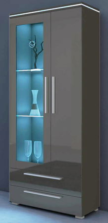 Moderní vitrína Leverkusen je vyrobena z těch nejkvalitnějších materiálů. Všechny komponenty tohoto nábytku jsou vyrobeny v Německu. Korpus je matné šedé barvy, přičemž dvířka jsou ve vysokém lesku. Prosklené části vitríny jsou z čirého skla a je možné si přiobjednat efektní RGB osvětlení, při kterém máte možnost vybrat si až z devíti různých barev podsvícení. Díky tomu si můžete podle nálady měnit atmosféru místnosti. Doporučujeme ji kombinovat s obývací stěnou a ostatním nábytkem Leverkusen.