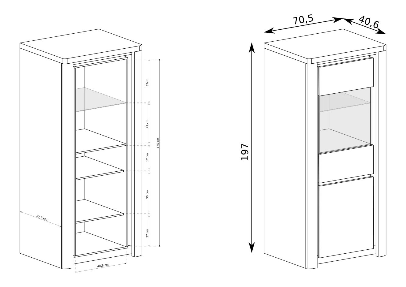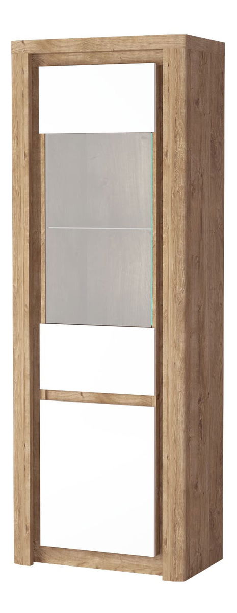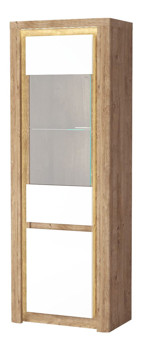 Dokonalá kombinace korpusu v dubu ribbeck a bílých lesklých předních dílů a prosklení. Taková vitrína bude nádherným dotvořením našeho interiéru. Doplňkové LED osvětlení skleněných polic odhalí porcelánové nádobí, krystaly nebo elegantní šálky. Vitrímu lze využít i jako knihovnu, do které budeme uzavírat knihy, které jsou pro nás cenné. Je univerzální, dvířka vitríny lze přišroubovat tak, že se otevírají vpravo nebo vlevo.