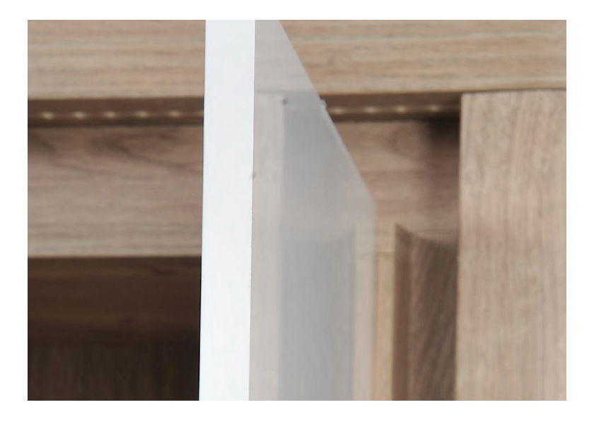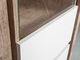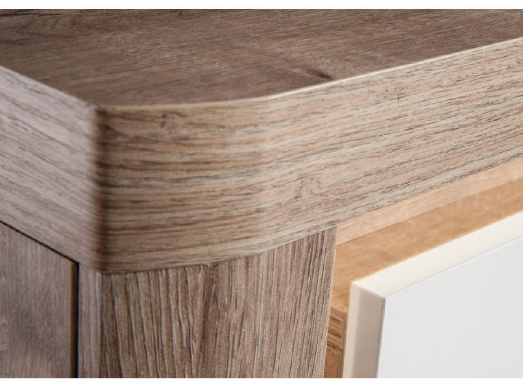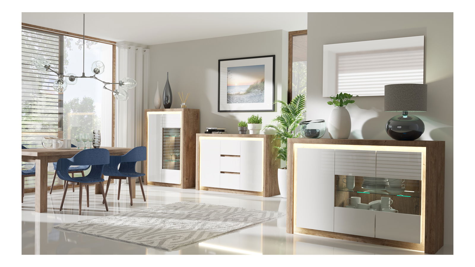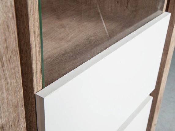ZobrazitProsklená vitrína v dubu ribbeck s bílými lesklými čely. Vitrína je rozdělena na dvě části, vpravo naleznete dvířka z tvrzeného skla a ve středu dvě skleněné police, které lze osvětlit LED světýlky. Po levé straně je šatní skříň s plnými dveřmi z laminované nábytkové desky. Uvnitř jsou dvě police. Vitrína má panty s tichým zavíráním. Tato vitrína se bude skvěle hodit do obývacího pokoje nebo jídelny k další komodě ze stejné kolekce.
