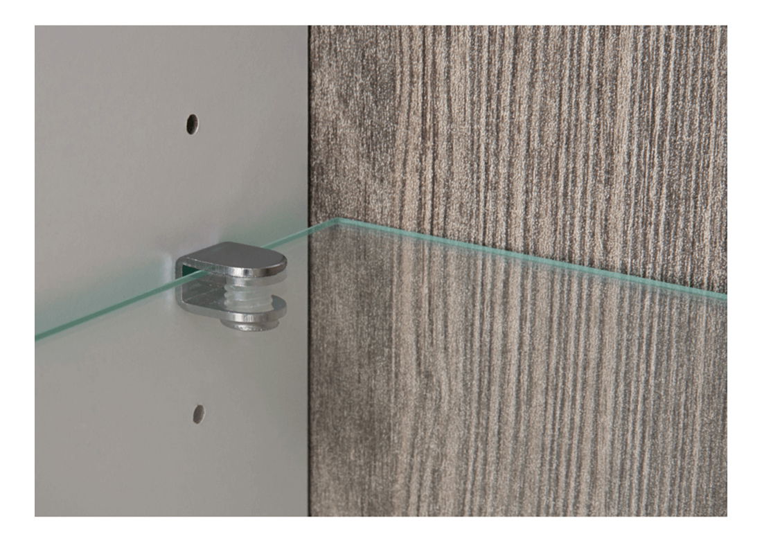 Vysoká úzká leská bílá vitrína , která má pravou část regálovou a levá horní část je uzavřena prosklenými dvířky. Uvnitř vitríny je použit odstín dřeva dub sonoma truflový. Výrazný designový prvek - pás v odstínu dřeva dub sonoma truflový zasahující přední dvířka a levou stěnu.