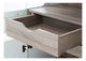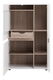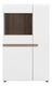 Nízká širší leská bílá vitrína , která má pravou část regálovou a levá horní část je uzavřena prosklenými dvířky. Uvnitř vitríny je použit odstín dřeva dub sonoma truflový. Výrazný designový prvek - pás v odstínu dřeva dub sonoma truflový zasahující přední dvířka a levou stěnu.