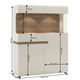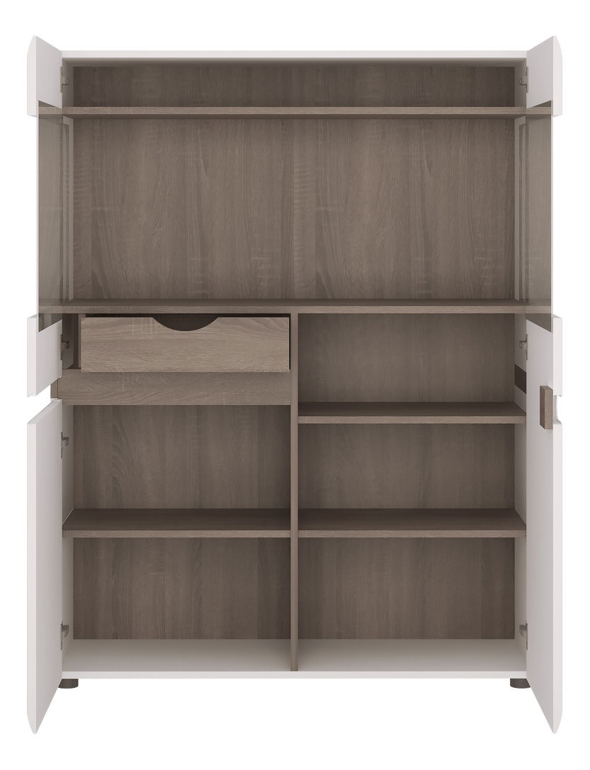 Luxusní sektorová sestava vhodná na zařízení obývacích pokojů. Je vyrobena z laminované DTD, která je odolná vůči poškrábání, vhlkosti a vysoké teplotě. Díky těmto vlastnostem prodlouží životnost Vašeho nábytku. Barevné provedení je bílá v kombinaci s barvou dřeva dub sonoma truflový. Přední části jsou vyrobeny z MDF bílé barvy s extra vysokým leskem HG. Příjemný německý design s elegantními hnědými doplňky. Dvířka jednotlivých skříněk mají moderní zaoblené hrany. Možnost dokoupení LED osvětlení do prosklených částí vitrín.
