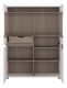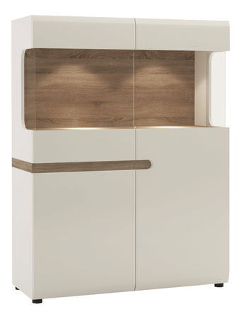 Nízká dvoudílná širší leská bílá vitrína , která je v horní části obou dílů uzavřena prosklenými dvířky. Uvnitř vitríny je použit odstín dřeva dub sonoma truflový lze dokoupit osvětlení. Výrazný designový prvek - pás v odstínu dřeva dub sonoma truflový zasahující přední dvířka a levou stěnu.