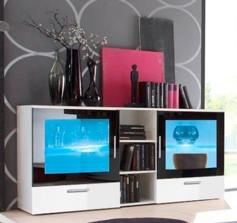 Vitrína Lyra moderního designu je navržena pro využití co nejvíce úložného a odkládacího prostoru. Za skleněnými dvířky, které jsou olemovány černým pásem, se nachází skleněná polička. Ta je pro zvýšení efektu podsvícená LED osvětlením. Ve střední části je otevřený prostor s dvěma poličkami. Skleněné části jsou vyrobeny z tvrzeného skla.