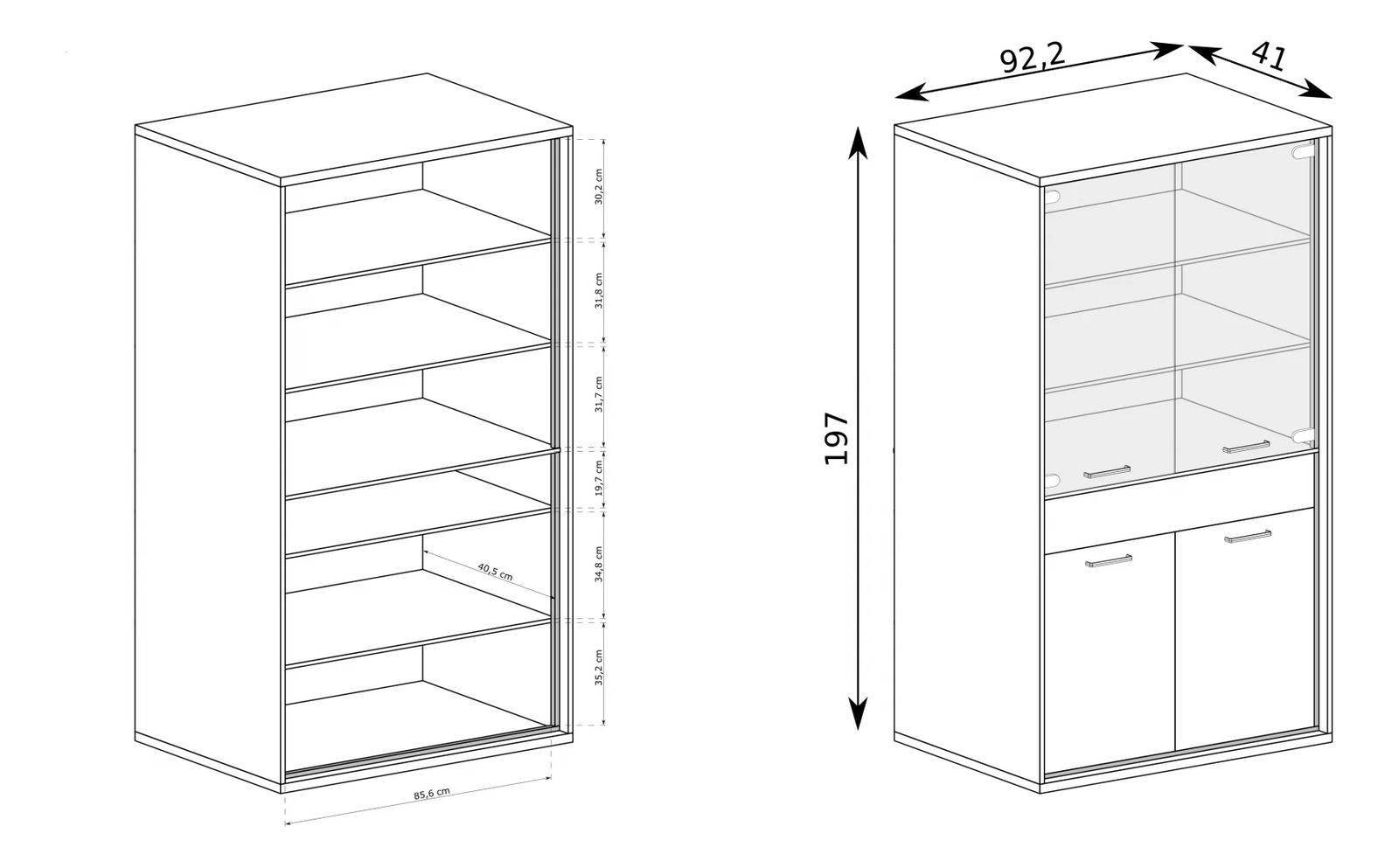 ZobrazitPřemýšlíte, jaký nábytek umístit do jídelny? Vitrína z kolekce Milley v přírodní barvě dřeva hickory. Kombinace dvoudveřové skříně ve spodní části nábytku a prosklené vitríny na vrchu. Nábytek dokonale zapadne do takových místností jako je jídelna, kancelář, obývací pokoj nebo obývací pokoj. V jídelně se bude skvěle vyjímat s vánočním nádobím, když využijeme možnosti zvýraznění polic. Vitrína se hodí k zařízení v moderním, industriálním stylu. Vrchní část šatní skříně tvoří dvojitá čela z kouřového, tvrzeného skla a dvě police z laminované desky. Spodek skříně jsou světlá čela s černými kovovými úchyty, za kterými máme poličku. Nad spodní šatní skříní je výsuvná zásuvkakterý se otevírá na dotek. Byl použit moderní systém otevírání push to open. Můžete použít doplňky jako černé nožičky, které budou ladit s černými lištami a vytvoří dokonalou kombinaci. Pro lepší efekt můžeme použít LED osvětlení skleněných polic a dekoračních tabulí.