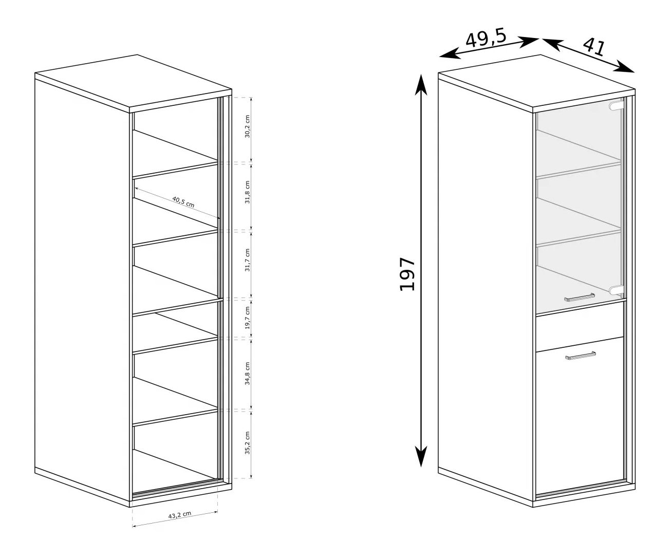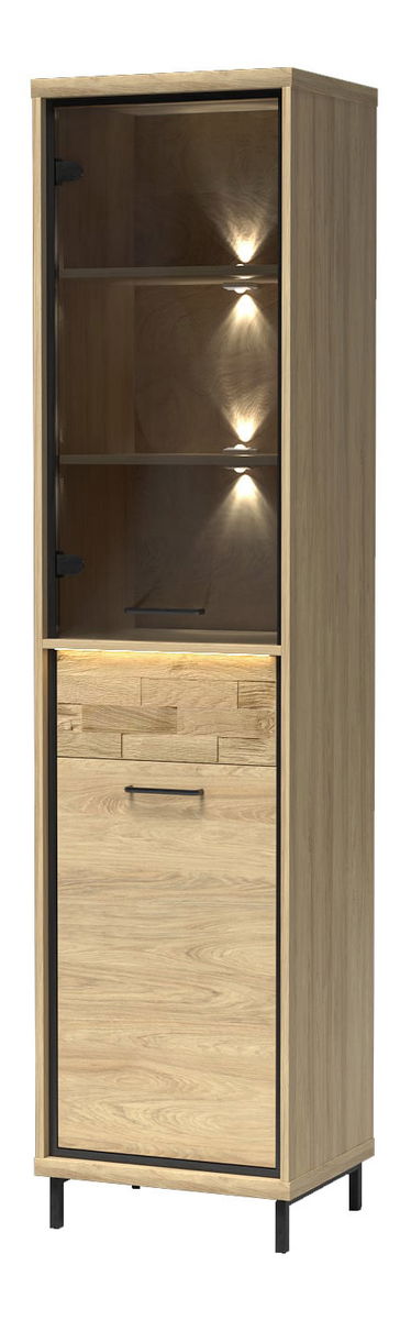 ZobrazitVitrína v přírodním hikoře s černými doplňky v podobě ozdobné lišty a černými kovovými úchyty. Vrchní část je prosklená vitrína se dvěma policemi z laminované desky a čelem z kouřového, tvrzeného skla. Spodní část je otevřená šatní skříň s jednou policí z lamina. Nad šatní skříní se nachází výsuvná zásuvka na vodítkách, která se otevírá velmi pohodlným způsobem - dotykem. Jako doplňkovou možnost umíme změnit čelo zásuvky na dřevěnou, dubovou, vyřezávanou desku, doplňkové LED osvětlení na policích vitríny a nad čelem zásuvky. Neutrální, teplé barevné osvětlení skříně dodá charakter každému interiéru. Šatní skříň se dá otevírat na pravou nebo levou stranu, je dostupná v univerzální variantě.