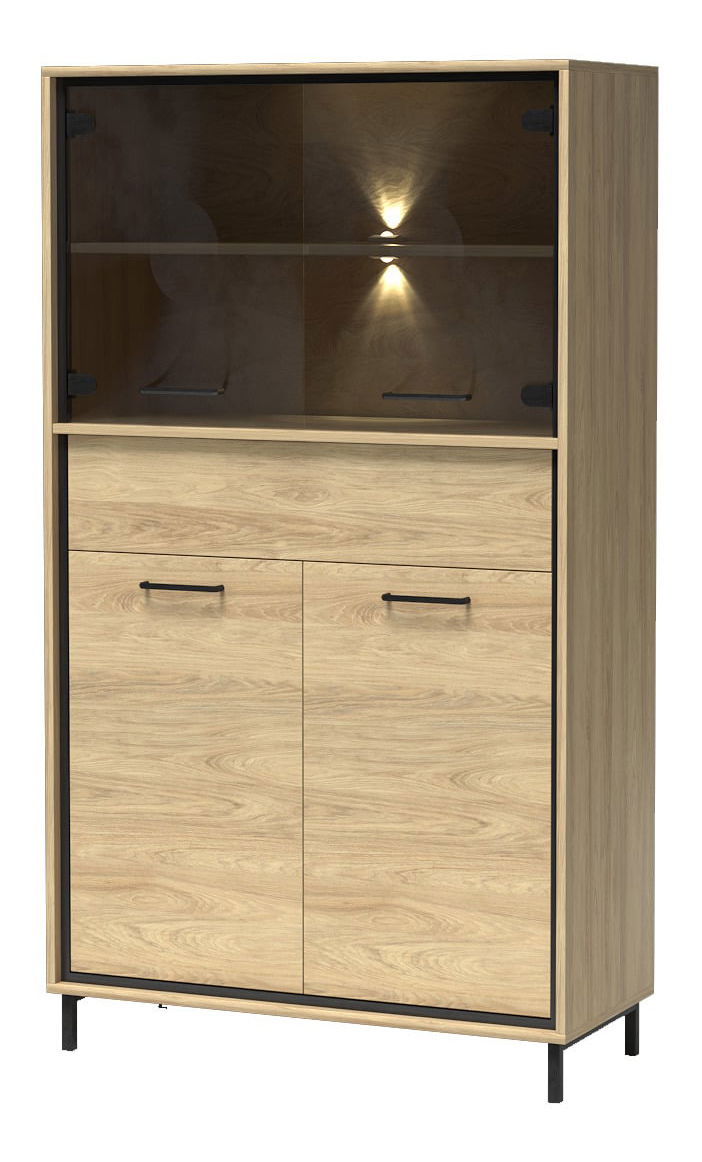 ZobrazitSvětlá nízká půldveřová vitrína z kolekce Milley je jednoduchá vitrína s prosklením a šatní skříň v jednom. V horní části skříňky je prosklení, kde si můžeme vystavit naše suvenýry, drobnosti nebo ozdobné předměty, které jsou pro nás důležité. Skleněná čela jsou bezpečná, tvrzené sklo s přídavkem kouřového efektu. Uvnitř je police z pevné, laminované desky. Do spodní části šatníku můžeme schovat věci, které používáme jen zřídka. Prostorná spodní šatní skříň má polici, díky čemuž je velmi prostorná a funkční. Pod skleněnou částí se nachází výsuvná zásuvka na vodítkách, kterou lze otevírat dotykem. Skříň má panty s tichým domečkem. V dodatečných možnostech lze přidat černé nohy a LED osvětlení police a krásná vyřezávaná dubová deska jako čelo zásuvky. Zásuvka může být také osvětlená, což vytvoří zajímavou atmosféru v našich interiérech.