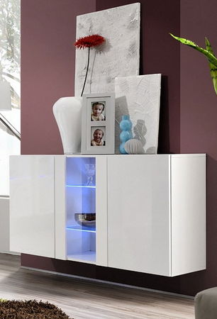 Vitrína na stěnu Fly I je vhodná pro umístění do moderního prostoru a kombinovatelná zejména s modelovou řadou Fly. Je třídílná, přičemž po bocích je úložný prostor s poličkou uzavřený dvířky a uprostřed se dvěma LED osvětlením podsvícené skleněné poličky uzavřen skleněnými dvířky. Fronty jsou vyrobeny ve vysokém lesku. Dvířka se otevírají pomocí bezúchytového systému PUSH - CLICK, kdy stačí jemně zatlačit na dvířka, pro otevření a opětovné zavření.