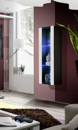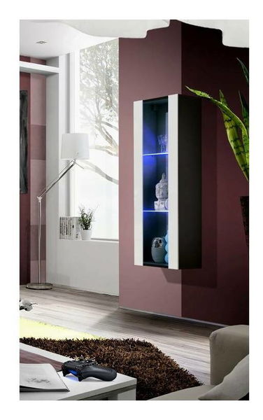Vitrína na zeď Fritz 23 ZW FY 21 (s osvětlením) je moderní a elegantní skříňka vhodná pro obývací pokoj. Skříňka je vyrobena z kvalitních materiálů a její barevné provedení v černém a lesklém bílém dokonale zapadne do jakéhokoli interiéru. Dvířka skříňky jsou vyrobena z lesklého PCV a otevírají se pomocí důmyslného systému PUSH-CLICK, který umožní otevření a zavření dvířek bez námahy. Uvnitř skříňky se nacházejí dvě poličky, které poskytují dostatek úložného prostoru pro různé předměty. Výška skříňky je 126 cm a hloubka 29 cm. Balík č.1 má rozměry 141x43x8 cm a váží 25 kg. Díky svému designu a praktickým vlastnostem je tato vitrína ideálním doplňkem pro každý obývací pokoj.