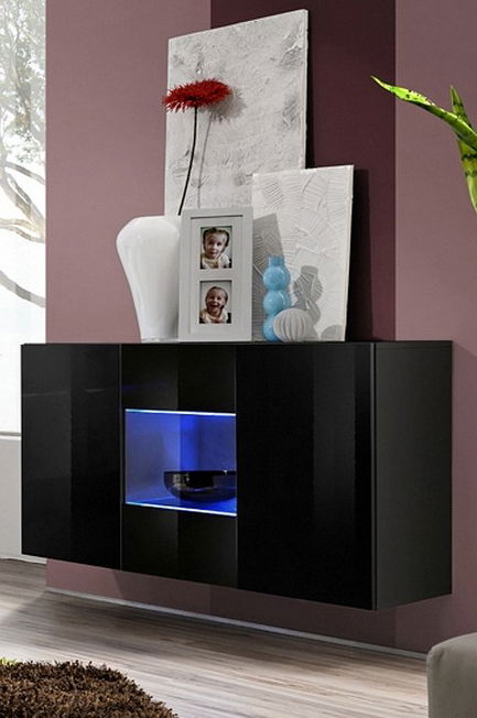 Vitrína na zeď Fritz 23 ZZ FY SBII s osvětlením v černém a lesk černém provedení je třídílná a ideální do moderního interiéru. Vitrína je kombinovatelná s modelovou řadou Fly. Po bocích se nachází úložný prostor s poličkou uzavřený dvířky a ve středu jsou dvěma LED osvětlenými skleněnými poličkami, uzavřenými skleněnými dvířky. Fronty jsou vyrobeny ve vysokém lesku. Dvířka se otevírají pomocí bezúchytového systému PUSH-CLICK, kdy stačí jemně zatlačit na dvířka, pro otevření a opětovné zavření. Vitrína má výšku 70 cm a hloubku 40 cm. Rozměry balíku 1 jsou 127x42x18 cm a váží 43 kg.