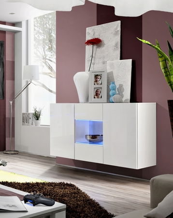 Vitrína na stěnu Fly I je vhodná pro umístění do moderního prostoru a kombinovatelná zejména s modelovou řadou Fly. Je třídílná, přičemž po bocích je úložný prostor s poličkou uzavřen dvířky a uprostřed se dvěma LED osvětlením podsvícené skleněné poličky uzavřené skleněnými dvířky. Fronty jsou vyrobené ve vysokém lesku. Dvířka se otevírají pomocí bezúchytového systému PUSH-CLICK, kdy stačí jemně zatlačit na dvířka, pro otevření a opětovné zavření.