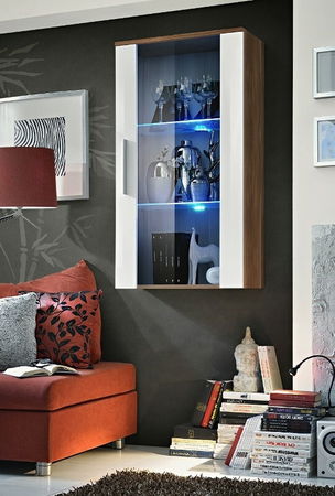 Vitrína na stěnu Neo II je vhodným doplňkem do každého obývacího pokoje, pracovny či kanceláře. Za prosklenými dvířky se nacházejí dvě skleněné poličky. Ty pro zvýšení efektu jsou podsvíceny LED osvětlením. Decentní úchyty dveří a zásuvek jsou dlouhé 25 cm. Je vyráběna ve více barevných provedeních a tak není problém ji zkombinovat s ostatním nábytkem v místnosti.
