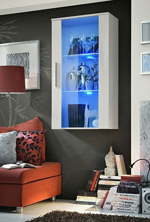 Vitrína na stěnu Neo II je vhodným doplňkem do každého obývacího pokoje, pracovny či kanceláře. Za prosklenými dvířky se nacházejí dvě skleněné poličky. Ty pro zvýšení efektu jsou podsvíceny LED osvětlením. Decentní úchyty dveří a zásuvek jsou dlouhé 25 cm. Je vyráběna ve více barevných provedeních a tak není problém ji zkombinovat s ostatním nábytkem v místnosti.