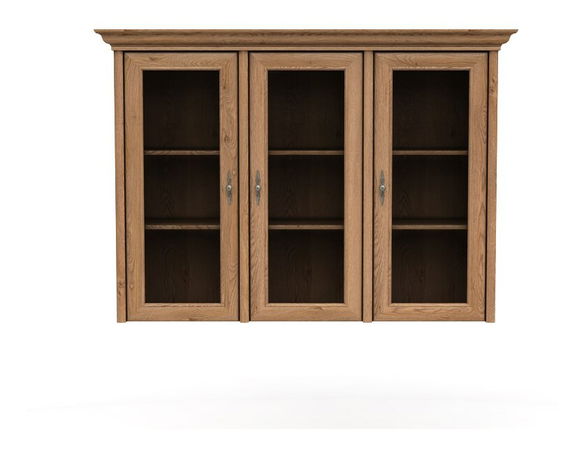 Široká vitrína pěkného rustikálního stylu, která bude opravdovým skvostem ve vašich obývacích pokojích nebo jídelnách. Vyřezávané vrchní lišty a jemné kované úchyty jí dodávají eleganci. Vitrína má troje dvířka a poličky pro všechny vaše oblíbené dekorativní předměty, porcelánové soupravy, knihy či jiné doplňky.
