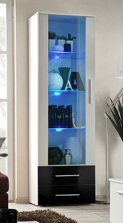 Vitrína Neo I je vhodným doplňkem do každého obývacího pokoje, pracovny či kanceláře. Ve spodní části se nacházejí dvě zásuvky, nad kterými je prostor uzavřen prosklenými dvířky se třemi skleněnými poličkami. Ty pro zvýšení efektu jsou podsvíceny LED osvětlením. Decentní úchyty dveří a zásuvek jsou dlouhé 25 cm. Je vyráběna ve více barevných provedeních a tak není problém ji zkombinovat s ostatním nábytkem v místnosti.