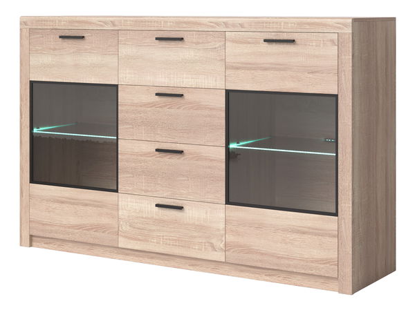 Vitrína Nerine s LED osvětlením je nejen efektní ale také praktická. Kromě dvířek za nimiž se nacházejí osvětlené skleněné poličky má totiž i zásuvky. Díky tomu se vitrína skvěle hodí do obývacího pokoje i kanceláře. Poličky LED s osvětlením využijete prdovšetkým na dekorace, zásuvky na věci potřebné v domácnosti nebo v kanceláři.