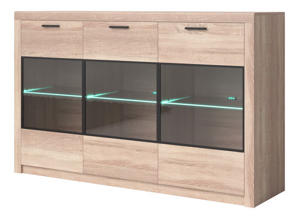 Vitrína Nerine s LED osvětlením poliček je skutečně moderní a elegantní nábytek, který upoutá pozornost na první pohled. Prosklené dvířka a osvětlené poličky dovolí vyniknout vašim oblíbeným dekoracím nebo věcem, které chcete vystavit na odiv. Vyrobena je z MDF desek.