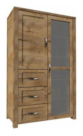 Prostorná vitrína Nevada s prosklenými dvířky v pravé části a plnými dvířky a třemi zásuvkami v levé části bude pěkným doplňkem vašich obýváků, pracoven nebo jídelen. Dvířka a zásuvky mají větší kovové úchyty. Je v pěkném provedení dub lefkas tmavý.